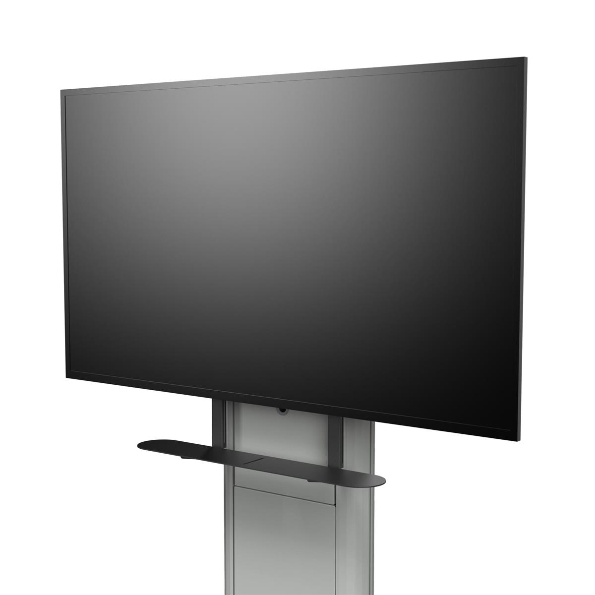 With this slim metal shelf placed under your display, you can easily place your sound bar, camera or other equipment in perfect position. Telescope function makes shelf fit displays from 55” to 85”. Secure your device to the shelf using the slot cut out. Works for both motorized and non-motorized stands. 3 mm sheet metal with powder coat.