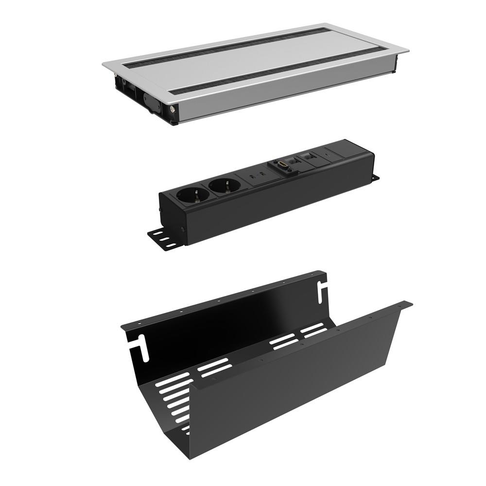 Complete package for a stylish and functional solution to the conference desk. The power strip in the kit is an Axessline Outlet Strip with 2 x power sockets (type F), 2x USB-C charger with max 30W , 2x data ports (RJ45), 1x USB-C data port and 1x HDMI. For a complete list of products in the kit, see below.