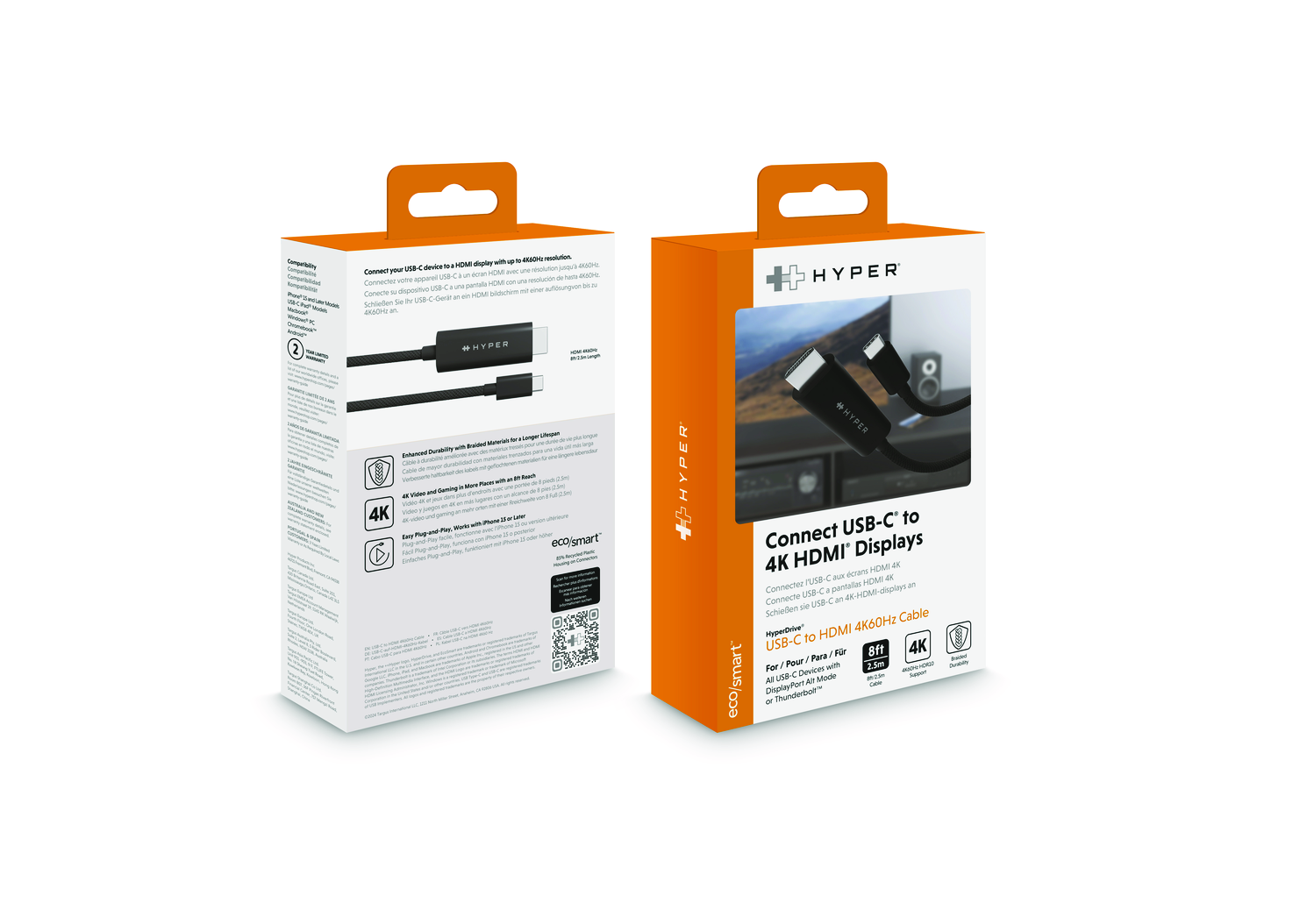 Directly connect your USB-C device to a HDMI display, with the HyperDrive USB-C to HDMI 4K60Hz Cable, a universal cable that allows you to easily share 4K HDR content, without the need for an adapter. The USB-C to HDMI cable features a durable braided 8ft/2.5m cable that has been tested to withstand over 25,000 bends. With universal USB-C compatibility*, the cable allows users with an iPhone 15, iPad, Android and other tablet USB-C devices to simply connect and start displaying media in 4K60Hz HDR directly from their mobile device – perfect for video creators, gamers and more.