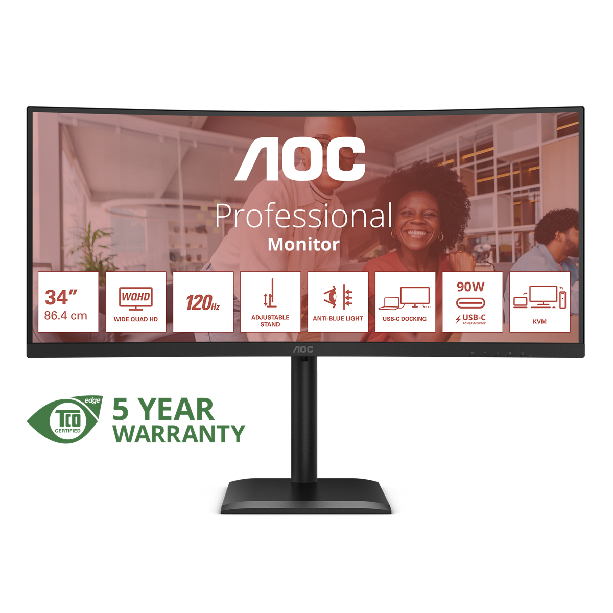 The CU34E4CV offers a 34" WQHD display with a 120Hz refresh rate, HDR10, and Hardware Anti-Blue Light for clear, comfortable viewing. Featuring Smart KVM, a 90W PD docking station, and a sleek, professional design, it's ideal for enhancing productivity and multitasking.