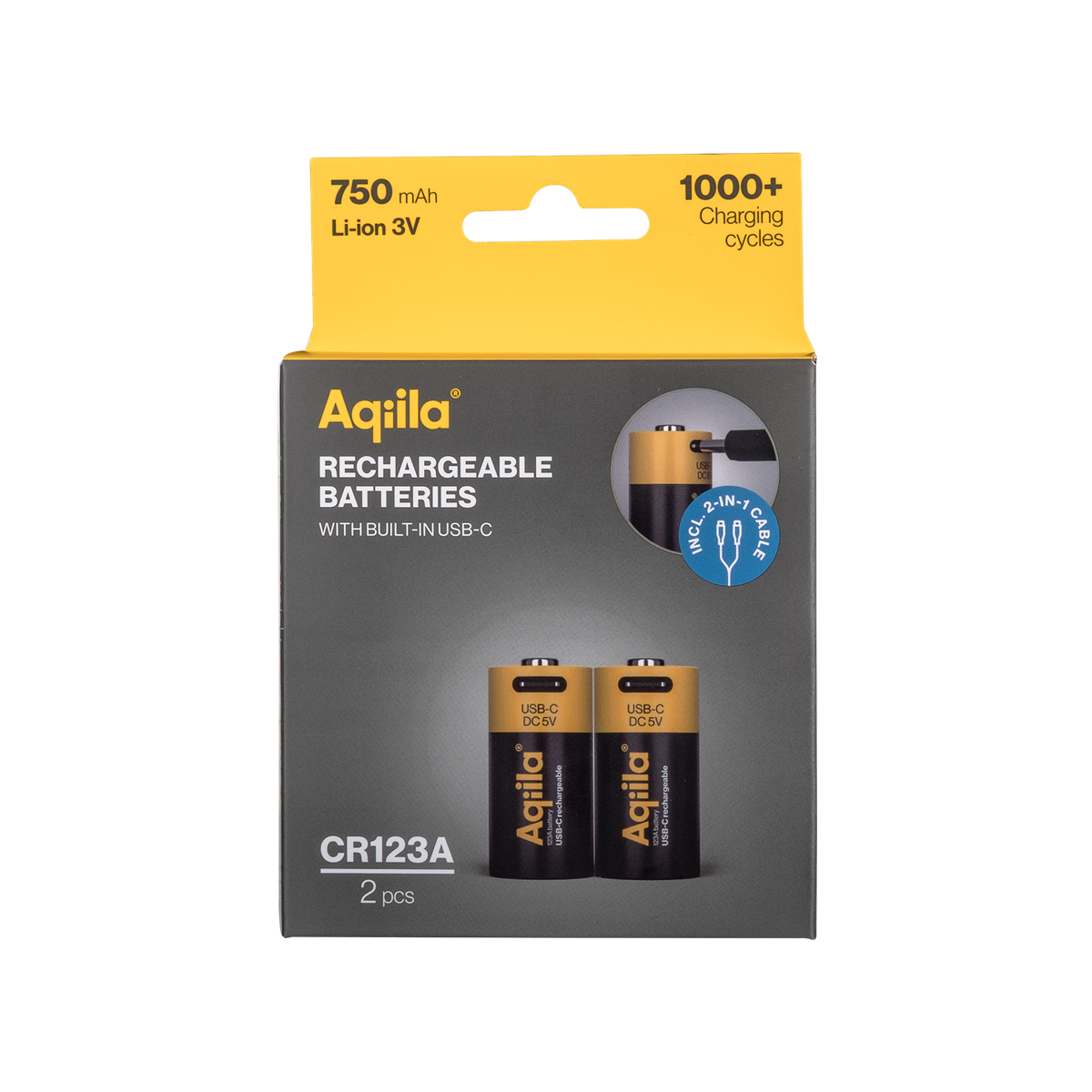 Aqiila Uppladdningsbart USB-C Lithium batteri CR123A 2-pack