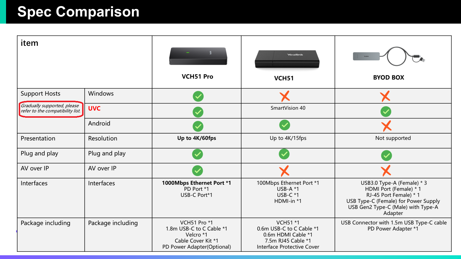 The Yealink VCH51 Pro is designed for effortless usability, deployment, and management. It has the capability to transform meeting rooms equipped with MVC, MeetingBar, or MeetingBoard devices into versatile conference environments compatible with various video conferencing platforms. Simply connect a USB-C cable to your laptop, launch your preferred video conferencing software, and immerse yourself in a superior meeting experience enhanced by the audio and visual technology of the conference room. Additionally, when connected to a PD power adapter, the VCH51 Pro can provide power to your PC. Furthermore, it enables seamless content presentation from your PC to a Yealink video conferencing system, providing a stable presentation experience with a maximum resolution of 4K/60fps in select situations.