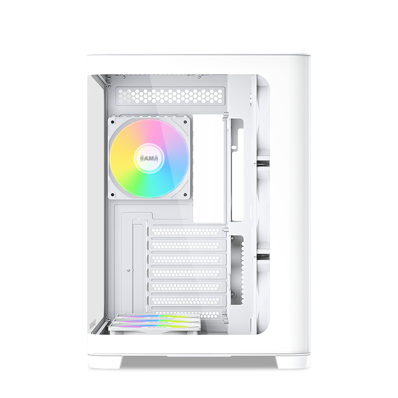 The SAMA V60 features tempered glass panels on both the front and side, designed with elegant curves at the connection points. This unique curved glass design adds a touch of sophistication, enhancing the visual appeal and providing a clear view of your build's interior components.