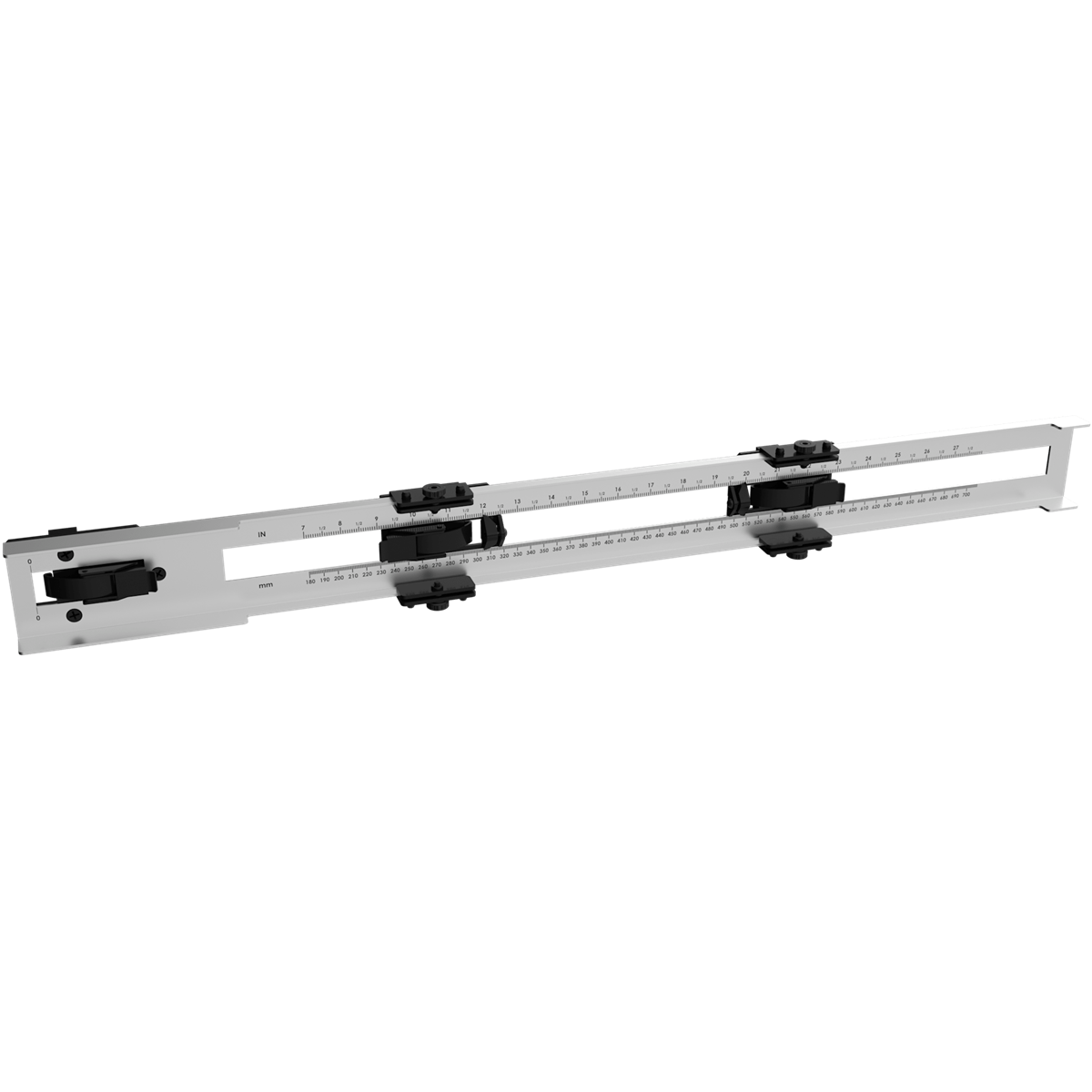 - The middle slider is set to width of the hole pattern of the LED cabinet. It is clamped onto the right-hand rail of the first column that you're measuring.