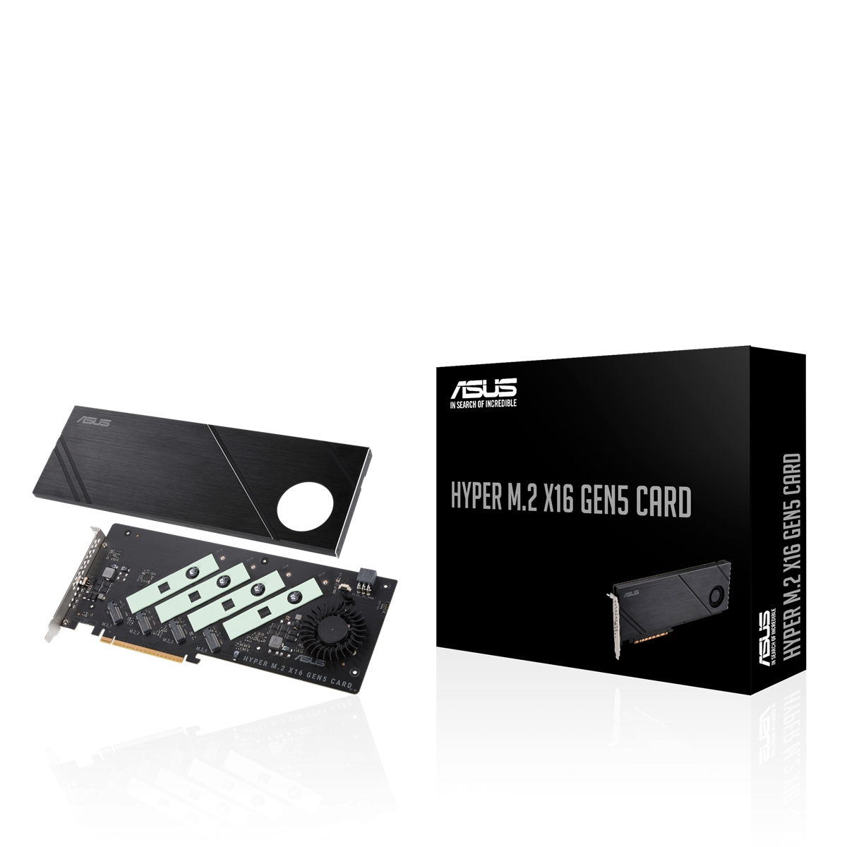 ASUS Hyper M.2 x16 Gen5 Card (PCIe 5.0/4.0) supports up to four NVMe M.2 (2242/2260/2280/22110) devices at up to 512 Gbps for RAID functions across diverse CPU platforms