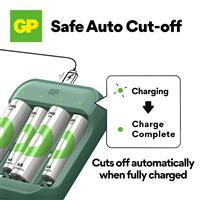 En pålitlig batteriladdare. Denna fyrfacksbatteriladdare kan ladda upp till fyra AA/AAA uppladdningsbara batterier på 6 timmar. Med LED-indikator som visar batteriets laddningsstatus, intelligent funktion för att upptäcka defekta batterier och automatisk avstängning för att förhindra överladdning, är dina batterier alltid redo när du behöver dem.