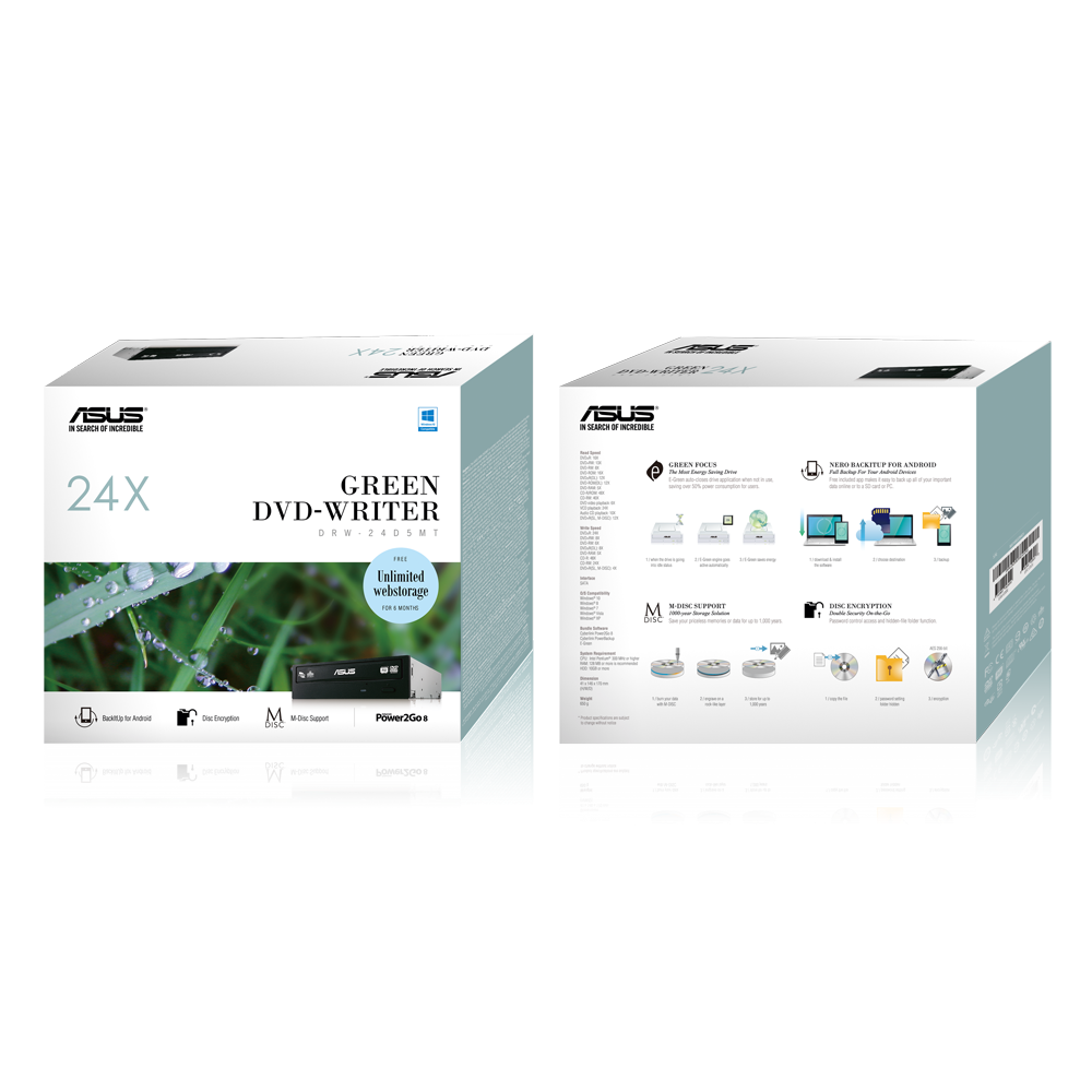 - 24X DVD writing speed\n- M-Disc support 1000-years storage solution\n- E-Green saves over 50% of power consumption\n- Back up data for your Android devices\n- ASUS Webstorage (Unlimited webstorage for 6 months)\n- Double the security with Disc Encryption II through password control and hidden file name functionality\n\nASUS DRW-24D5MT is a power-saving 24X DVD Writer that provides you with the flexibility and efficiency for multimedia data storage, and the most complete data backup solution with M-Disc support.\n\nGREEN FOCUS\nThe Most Energy Saving Drive\n\nE-Green auto-closes drive application when not in use, saving over 50% power consumption for users.\n\nNERO BACKITUP FOR ANDROID\nFull Backup For Your Android Devices\n\nFree included app makes it easy to back up all of your important data online or to a SD card or PC.\n\nM-DISC SUPPORT\n1000-years Storage Solution\n\nSave your priceless memories or data for up to 1,000 years.\n\nDISC ENCRYTION II\nDouble Security On-the-Go\n\nPassword control access and hidden-file folder function.