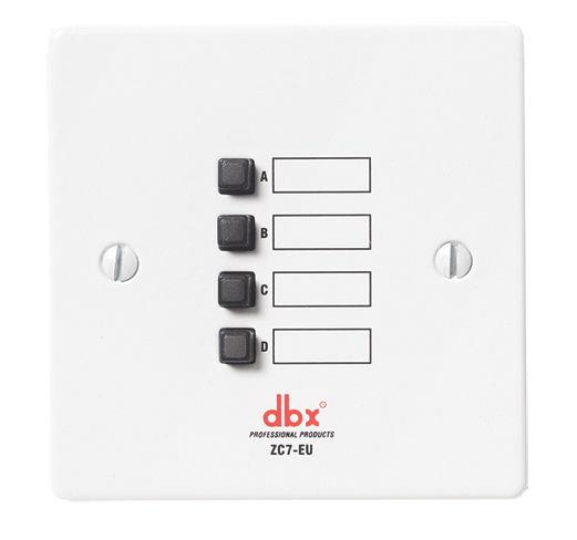 The remote device shall provide programmable push-to-talk page assignment for the dbx® ZonePRO™ devices. The remote device shall have DIP switches allowing identification with connection to the processing device via CAT 5 cable on RJ-45 connectors. The device shall be a dbx ZC-7-EU remote controller.